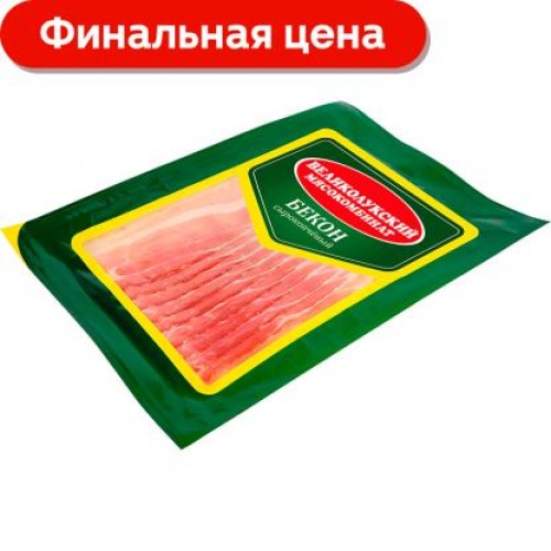 Бекон Великолукский МК из свинины сырокопченый нарезка 150г в магазинах Магнит
