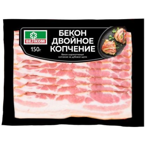 После копчения бекон нарезается на тонкие ломтики и упаковывается в прозрачный пакет, что позволяет покупателю оценить внешний вид продукта. Затем нарезанный бекон фасуется по 150 грамм.