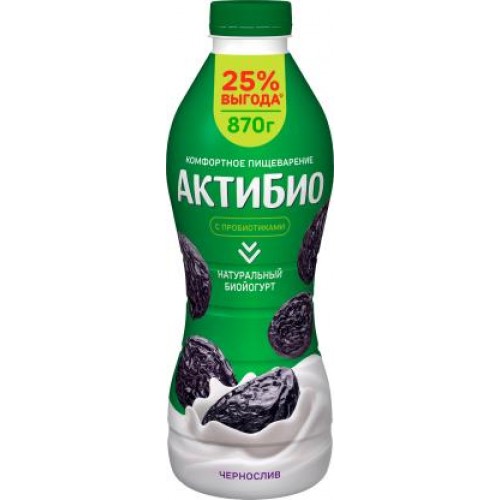 Биойогурт питьевой АктиБио Чернослив 1,5% 870 г - это вкусный и полезный кисломолочный продукт, изготовленный из молока с добавлением натурального пюре и кусочков чернослива. Йогурт обладает оригинальным сливовым вкусом и нежной консистенцией, которая отлично подходит для легкого перекуса или в качестве добавки к завтраку.