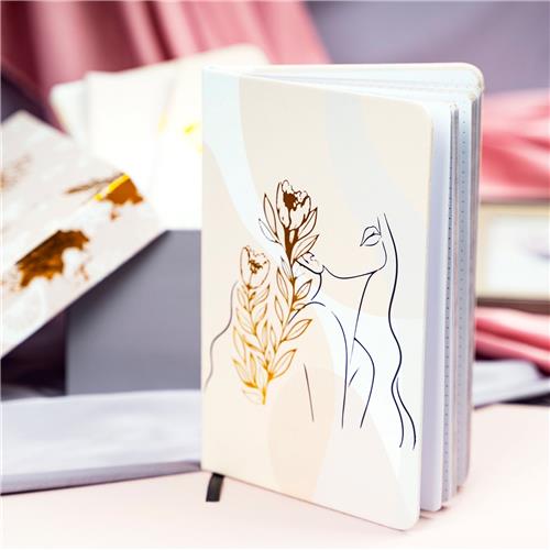 Блокнот With Love - это прекрасный выбор для личных или рабочих записей. Он имеет стильный дизайн, который будет радовать каждый день. Обложка блокнота украшена изображением женского силуэта и золотистыми цветами, что придает ему особый шарм.