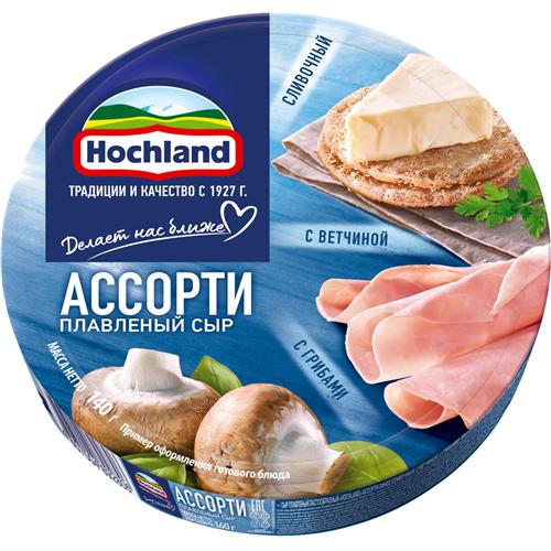 БЗМЖ СЫР ПЛАВЛЕНЫЙ ПАСТООБРАЗНЫЙ HOCHLAND АССОРТИ СИНЕЕ СЛИВОЧНЫЙ, С ВЕТЧИНОЙ, С ГРИБАМИ 50%, 140г. в магазинах Пятерочка