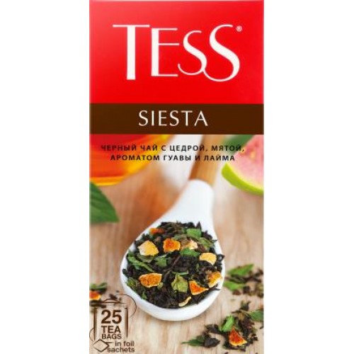 Чай черный Tess Siesta с цедрой гуавы-лайма и мятой в пакетиках по 25 штук - это изысканный напиток, сочетающий в себе ароматы тропических фруктов, освежающей мяты и высококачественного черного чая.