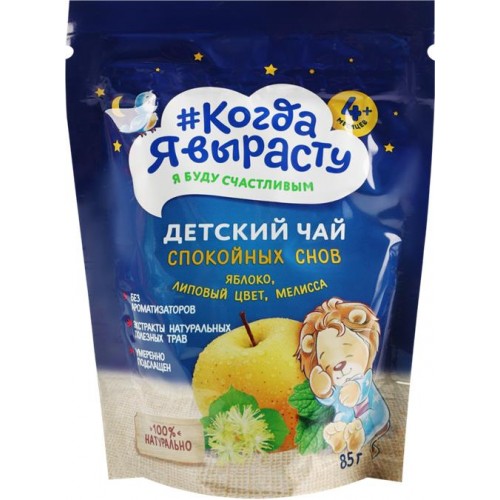 Чай КОГДА Я ВЫРАСТУ - это натуральный и полезный детский напиток, разработанный специально для детей старше 4 месяцев. Этот чай с нежным вкусом яблока, липы и мелиссы поможет успокоить ребенка перед сном, а также снизить чрезмерное вздутие живота и улучшить обмен веществ.