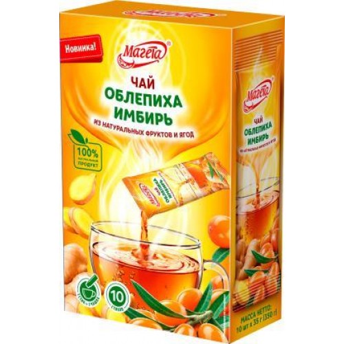 Чай травяной «Магета Облепиха-Имбирь» в стиках по 10 штук, общий вес 350 грамм - это вкусный и полезный напиток, изготовленный из натурального сырья. В основе продукта экстракт зеленого чая, который обогащен ароматом облепихи, имбиря и других полезных ингредиентов.
