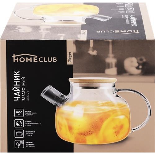 Чайник заварочный HOMECLUB Ginger, боросиликатное стекло, бамбук, крышка, 1л в магазинах Лента