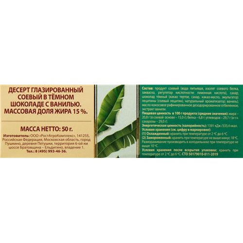 Десерт соевый А.РОСТАГРОКОМПЛЕКС с ванилью в темном шоколаде 15%, 50г в магазинах Лента