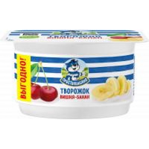 Попробуйте творожный десерт «Простоквашино» и ощутите всю прелесть сочетания вкусов вишни, банана и творога. Подарите себе и своим близким наслаждение этим прекрасным лакомством!