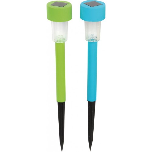 Панель солнечных батарей имеет размер 25х25 мм, а в качестве источника света используется один белый LED элемент. Фонарь представлен в различных цветовых вариантах: зеленый, голубой, желтый и бордовый, что дает возможность выбрать наиболее подходящий вариант для вашего участка.