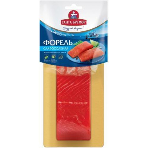 Форель слабосоленая Санта Бремор филе-кусок весом 150 г - это вкусный и питательный продукт, богатый белком, Омега-3 кислотами, витаминами и минералами. Упругое и мягкое филе форели обладает приятным вкусом и ароматом, хорошо сочетающимся со сливочным маслом и свежим багетом, а также может быть использовано для приготовления разнообразных салатов, закусок и канапе. Этот продукт станет отличным дополнением к вашему завтраку или закуске.