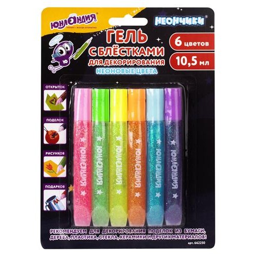 Гель с блестками для декора ЮНЛАНДИЯ Неончики, 6 цветов х 10,5 мл (kastd) в магазинах Ашан