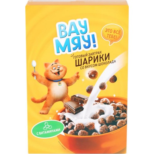 Готовый завтрак ВАУ МЯУ Шарики со вкусом шоколада – это настоящее лакомство для всех любителей шоколадных десертов. Он выполнен в виде вкусных и хрустящих объемных шоколадных шариков, которые покрыты ароматной глазурью. Цвет продукта варьируется от светло- до темно-шоколадного, что придает ему дополнительную привлекательность.