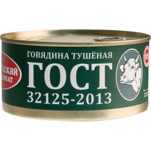 Тушеная говядина изготовлена согласно ГОСТу, а ее состав включает только натуральные ингредиенты: говядину, соль, черный перец и лавровый лист. В процессе тушения мясо выделяет большое количество сока, который используется в качестве ароматной заливки.