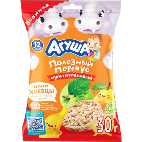 Хлебцы мультизлаковые хрустящие АГУША Полезный перекус, со вкусом яблока, банана и груши, с 12 месяцев, 30г в магазинах Лента