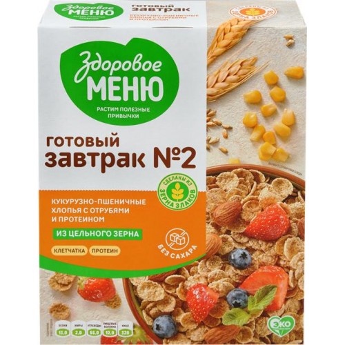 Хлопья кукурузно-пшеничные ЗДОРОВОЕ МЕНЮ №2 из пророщенного зерна с отрубями и протеином, 200г в магазинах Лента