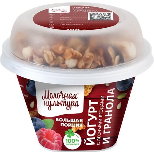 Йогурт МОЛОЧНАЯ КУЛЬТУРА с лесными ягодами (малина, черника, земляника) с гранолой и изюмом, жирность 2,7-3,5% - это восхитительное сочетание натуральных ингредиентов, воплощенное в нежном и вкусном десерте. Без заменителей молочных жиров.