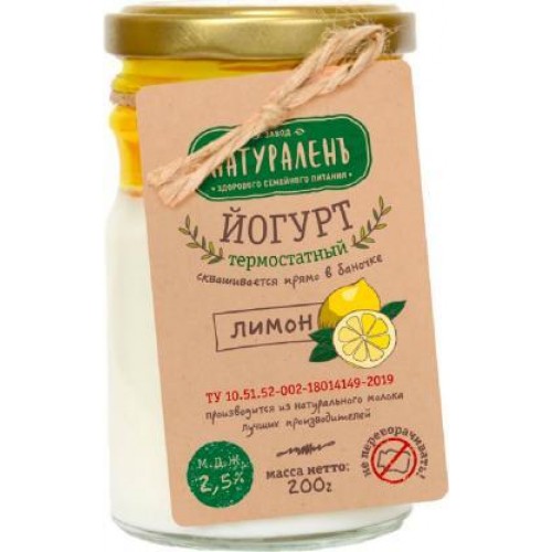 Название товара: Йогурт Натураленъ Лимон Термостатный, жирность 3.2%, вес 200 г.