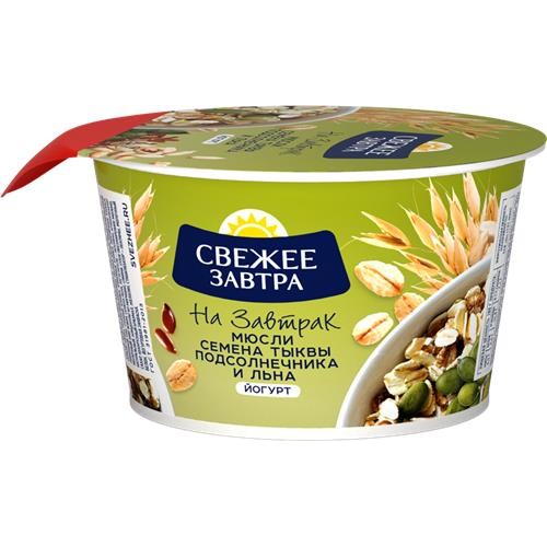 Йогурт СВЕЖЕЕ ЗАВТРА На Завтрак Мюсли, семена тыквы, подсолнечника и льна 6%, без змж, 150г в магазинах Лента