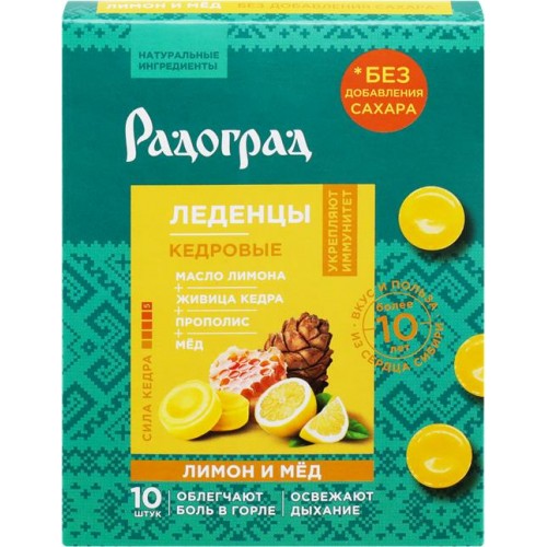 Ваши любимые магазины Лента предлагают продукт, который станет незаменимым помощником при первых признаках простуды. Живичные леденцы РАДОГРАД - это 100% натуральный состав, включающий в себя живицу кедра, кедровое масло, прополис, масло лимона и витамин С.
