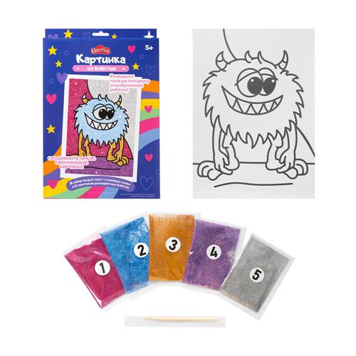 В состав набора входят: холст с уже нанесенным клеевым слоем (34.5х24см), 5 разноцветных пакетов с блестками, а также подробная инструкция, которая поможет ребенку сделать красивую и аккуратную картинку.