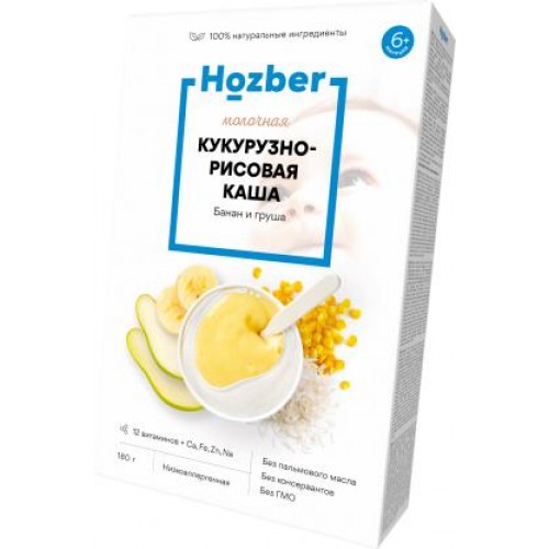 Каша Hozber молочная кукурузно-рисовая банан и груша с 6 месяцев 180г в магазинах Магнит
