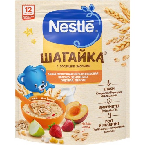 Каша мультизлаковая NESTLE Шагайка молочная, с яблоком, садовой земляникой и персиком, с 12 месяцев, 190г в магазинах Лента