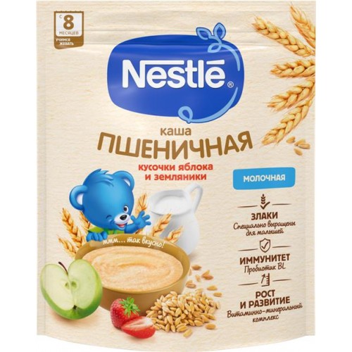 Каша пшеничная NESTLE молочная, с кусочками яблока и земляникой, с 8 месяцев, 200г в магазинах Лента