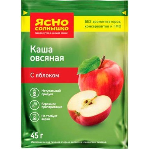 Каша Ясно Солнышко овсяная с яблоком весом 45 г – это натуральный продукт для быстрого приготовления, не содержащий ароматизаторы, консерванты и ГМО. Состав продукта включает в себя только качественные ингредиенты: овсяные хлопья, сушеные яблоки, сахар и соль. Один пакетик рассчитан на одну порцию, которую можно приготовить, просто залив его содержимое кипятком или горячим молоком в чашке. Для улучшения вкуса можно добавить немного сливочного масла.