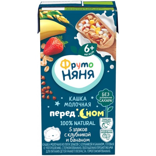 Кашка мультизлаковая ФРУТОНЯНЯ Пред сном, молочная из пяти злаков с клубникой и бананом, с 6 месяцев, 200мл в магазинах Лента