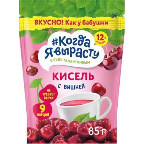 Кисель «Когда я вырасту» Вишня с 12 месяцев 85 г - это сухая смесь для приготовления вкусного и полезного напитка для детей старше года. Основу киселя составляет натуральный порошок из вишневого пюре, который придает напитку насыщенный вкус и аромат. Экстракт гибискуса, входящий в состав, обогащает кисель витаминами и минералами.
