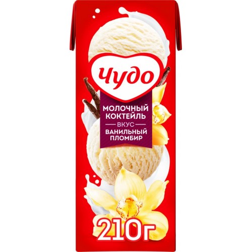 Коктейль молочный ЧУДО Ванильный пломбир 2%, без змж, 210г в магазинах Лента