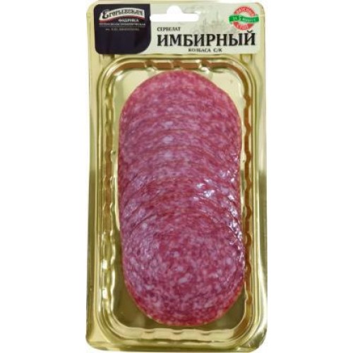 Колбаса Егорьевская KGФ Сервелат Имбирный Сырокопченый Нарезка 100 г - это изысканный деликатес с насыщенным мясным вкусом и ароматом. Пряные специи и нотки копчения дополняют его богатый вкус. Оттенок грецкого ореха в аромате придает ему особую изысканность. В состав этой сырокопченой колбасы входит высококачественная свинина и нежный шпик, которые делают ее текстуру особенно мягкой и сочной. Тонкие ломтики сервелата нарезаны аккуратно и ровно, что позволяет легко сервировать их на стол. Вес нарезки составляет 100 грамм, что идеально подходит для небольшой компании или для добавления в качестве ингредиента в другие блюда. Упаковано в защитную атмосферу, чтобы сохранить свежесть и качество продукта.