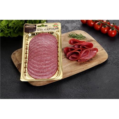 Произведенный в Европе в XVI-XVII веках, сервелат Мускатный создан по образу древнеримских колбас с использованием свинины. Благодаря высокому содержанию жира (до 50%), колбаса обладает нежной консистенцией, ярким мясным вкусом и мускатным ароматом. Мелкий бисер шпика на срезе придает продукту неповторимый вид. Идеально подходит для праздничного ужина и дополнения различных блюд. Нарезанный ломтиками, сервелат станет отличным выбором для утреннего бутерброда к кофе.