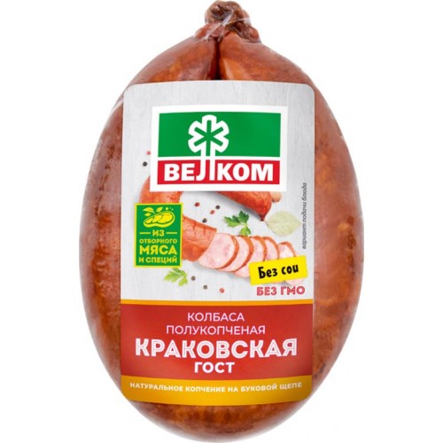 Колбаса полукопчёная ВЕЛКОМ Краковская – это сочетание традиций ГОСТ и высокого качества от производителя. В её основе охлаждённое мясо, пикантная грудинка и ароматные специи – перец и чесночок. Теперь вы можете приобрести этот изысканный продукт со значительной скидкой в , где действует программа лояльности для держателей карт покупателей. Насладитесь неповторимым вкусом настоящей Краковской колбасы и экономьте с картой Лента!