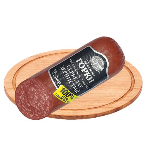 Колбаса Сервелат Зернистый БЛИЖНИЕ ГОРКИ варено-копченая, в/у, 330г в магазинах Авоська