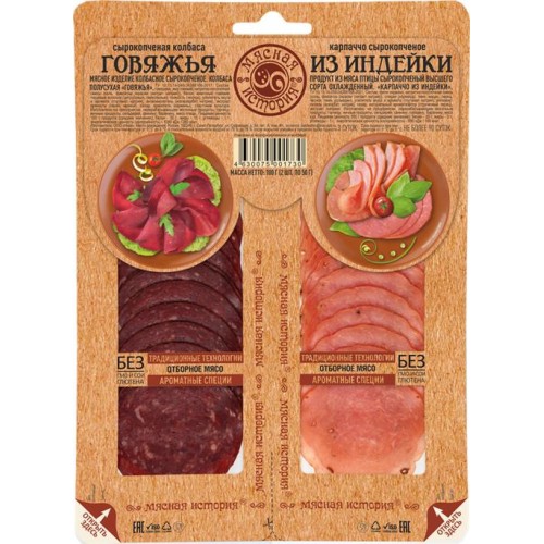 Колбаса сырокопченая МЯСНАЯ ИСТОРИЯ Говяжья/Карпаччо из индейки, нарезка, 100г в магазинах Лента