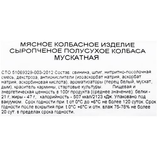 Преимущества продукта: Изысканный пряный аромат с нотками мускатного ореха и белого перца делают эту колбасу неповторимой. Продукт идеально подойдет для тех, кто ценит высокое качество и изысканный вкус.