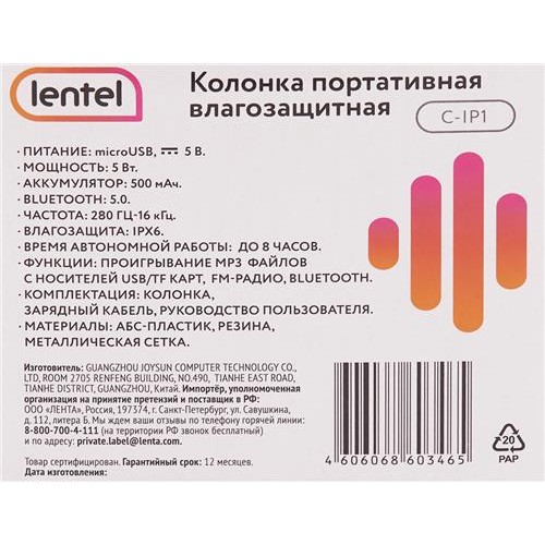 Колонка портативная LENTEL влагозащитная, Арт. C-IP1 в магазинах Лента