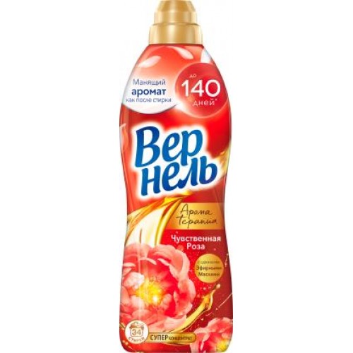 Концентрированный кондиционер для белья Vernel Ароматерапия Чувственная роза объемом 870 мл предназначен для 34 стирок и обеспечивает вашему белью непревзойденную мягкость и яркий аромат гибискуса и розы. Специальные аромакапсулы позволяют наслаждаться интенсивным запахом белья до 140 дней при его хранении без использования.