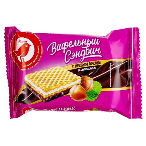 Конфеты АШАН Красная птица Вафельный сэндвич со сливочно-шоколадным вкусом и лесными орехами частично глазированный, вес (kastd) в магазинах Ашан