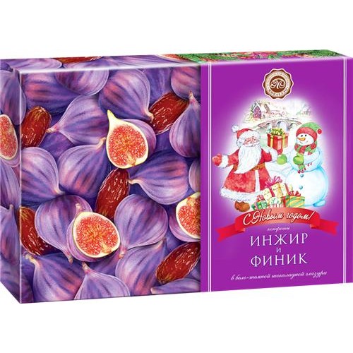 Инжир сушеный, финик, шоколадная глазурь белая и темная (сахар, эквивалент какао масла на основе растительных масел: пальмовое и ши,регулятор кислотности: лимонная кислота, какао-порошок, какао тертое, сухое обезжиренное молоко, сухое цельное молоко, эмульгаторлецитин, ароматизатор идентичный натуральному: ванилин), сахар.