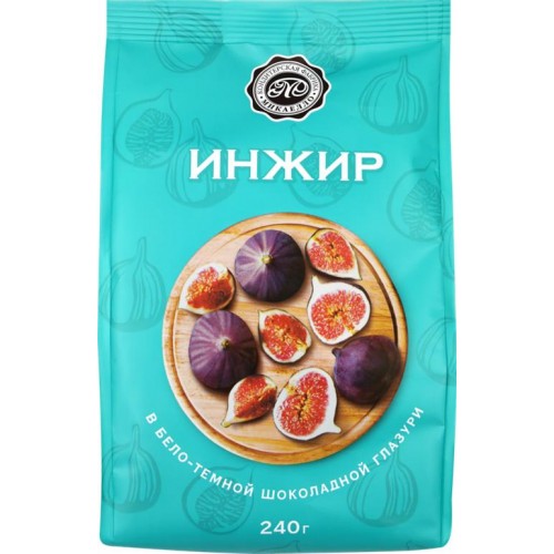Инжир сушеный, шоколадная глазурь белая и темная (сахар, эквивалент какао-масла на основе растительных масел – пальмового и ши,регулятор кислотности: лимонная кислота, какао-порошок, какао тертое, сухое обезжиренное молоко, сухое цельное молоко, эмульгатор:лецитин, ароматизатор "ванилин", идентичный натуральному), сахар.