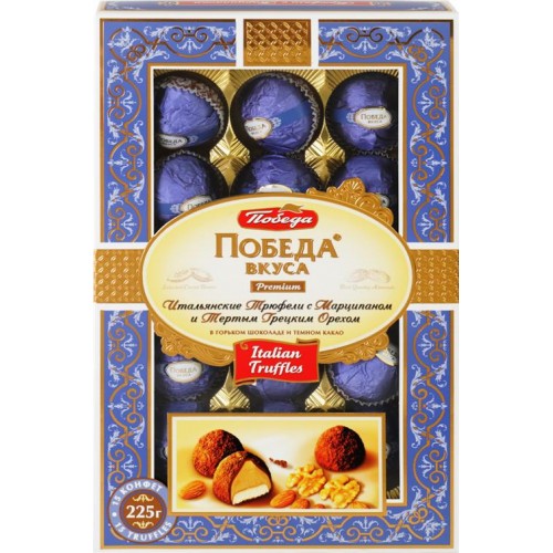 Конфеты ПОБЕДА ВКУСА Итальянские трюфели с марципаном и тертым грецким орехом, в горьком шоколаде и темном какао, 225г в магазинах Лента