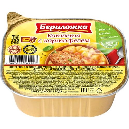 Бериложка. Котлета с картофелем быстро утолит голод, восстановит силы и зарядит энергией. Эта консерва – отличный выбор для тех, кто ведет активный образ жизни или просто хочет сэкономить время на приготовлении обеда.