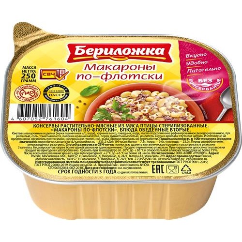 Консервы мясо-растительные БЕРИЛОЖКА Макароны по-флотски, 250г в магазинах Лента