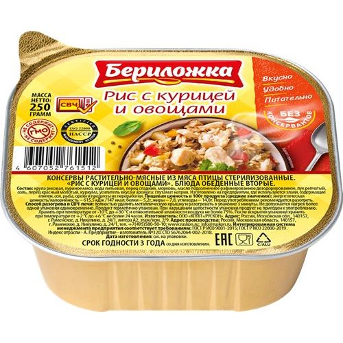 Консервы мясо-растительные БЕРИЛОЖКА Рис с курицей и овощами, 250г в магазинах Лента