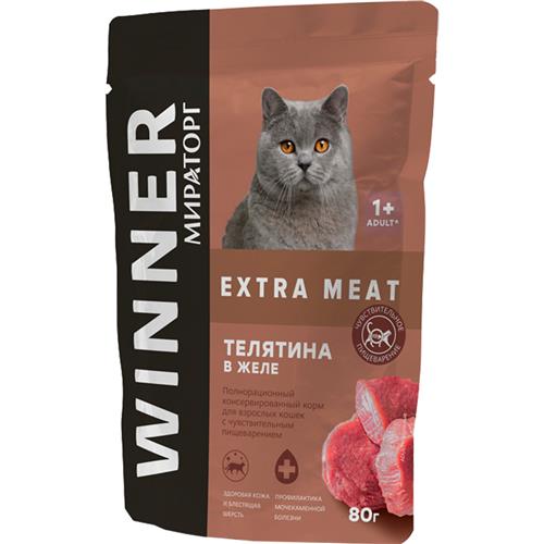 Корм консервированный для взр кошек с чувств пищев Телятина в желе 80г WINNER EXTRA MEAT в магазинах Пятерочка