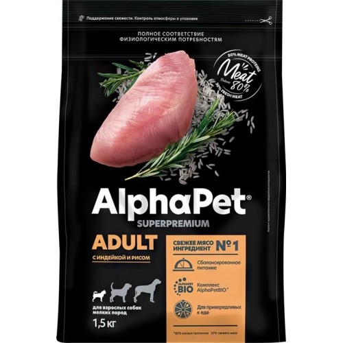 Корм сухой для взрослых собак АЛЬФА ПЕТ с индейкой и рисом, для мелких пород, 1,5кг в магазинах Лента