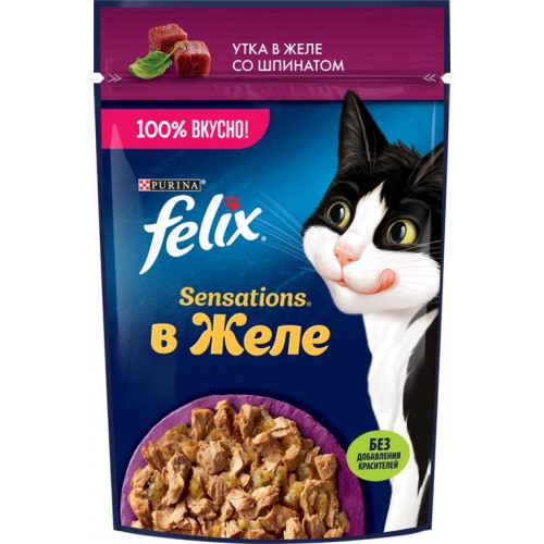 Корм влажный для взрослых кошек FELIX Sensations Утка в желе со шпинатом, 75г в магазинах Лента