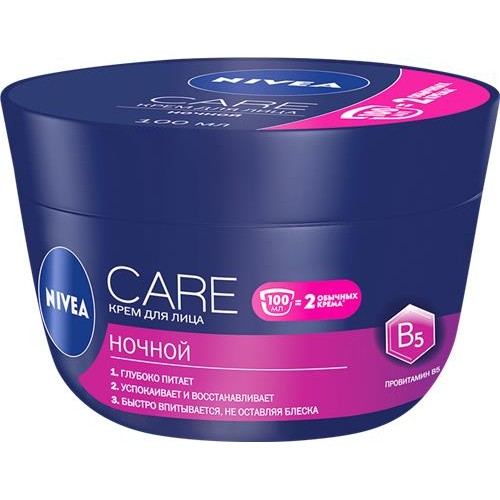 Крем ночной для лица NIVEA Care - это идеальное решение для глубокого питания, успокоения и восстановления кожи во время сна. Этот продукт от известного бренда NIVEA обеспечивает вашей коже полноценный уход, не оставляя после себя пленки или жирного блеска.
