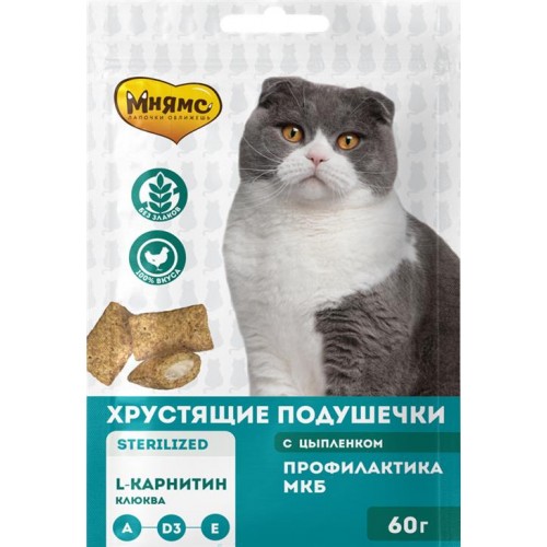 Лакомство для кошек МНЯМС Профилактика МКБ Хрустящие подушечки с цыпленком и клюквой, 60г в магазинах Лента